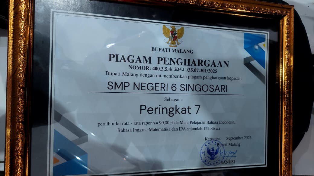 SELAMAT UNTUK SMP NEGERI 6 SINGOSARI MENDUDUKI PERINGKAT KE-7 SE-KABUPATEN MALANG